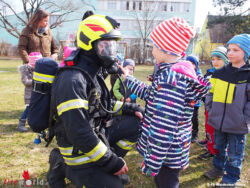 Weiter ging es mit der Vorstellung der mitgebrachten Einsatzbekleidung. Das war für die Kinder sehr interessant, da sie die Einsatzbekleidung inklusive Helm auch gleich mal selber anprobieren konnten. Danach wurde den Kindern die Atemschutzausrüstung vorgestellt, indem sich ein Feuerwehrmann vor ihnen mit einem Atemschutzgerät ausrüstete. Um die Angst vor dem voll ausgerüsteten und nicht mehr erkennbaren Feuerwehrmann zu verlieren, durften alle Mutigen die Ausrüstung von der Nähe betrachten und angreifen.