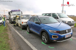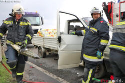 Daher galt es für die Kräfte der Feuerwehr, zuerst den Auffahrunfall zu bearbeiten, um überhaupt den eigentlich alarmierten Einsatz in Angriff nehmen zu können. Im mittleren der drei Fahrzeuge, einer Pritsche befand sich zu diesem Zeitpunkt noch eine unbestimmten Grades verletzte Person, welche zwar bereits vom Rettungsdienst versorgt wurde, sich jedoch aufgrund der Verformung des Fahrzeuges nicht mehr selbst aus ebendiesem befreien konnte. Daher entschied der Einsatzleiter, die Beifahrertür mittels hydraulischem Spreizer zu öffnen, um dem Verletzten ein schonendes Aussteigen ermöglichen zu können.