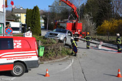 Ein Auto kam bei einem Unfall aus bisher unbekannter Ursache von der Fahrbahn ab und landete in den Sträuchern neben der Straße. Die Lenkerin konnte das Auto aufgrund der Sträucher nicht verlassen. Die Feuerwehr ermöglichte dann einen möglichst schonenden Ausstieg. Das Unfallfahrzeug wurde anschließend mit dem Kran geborgen.