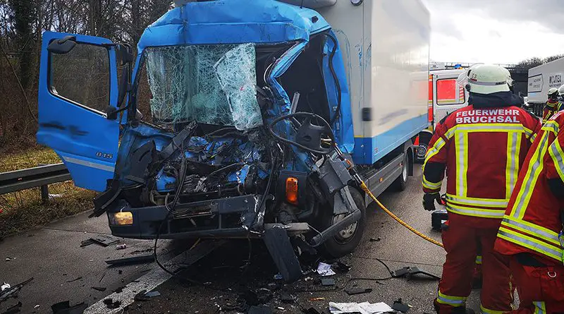 mehr lesen ...BRUCHSAL (DEUTSCHLAND): Bei einem Auffahrunfall zwischen zwei Lkw wurde am Donnerstagnachmittag, 7. März 2019, ein Lkw-Fahrer auf der BAB 5 bei Bruchsal schwer in seinem Führerhaus eingeklemmt. Die Feuerwehr musste den schwer verletzten Fahrer mit hydraulischem Rettungsgerät befreien.