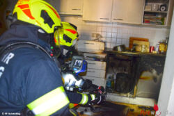 Ein Atemschutztrupp drang im Innenangriff in die Wohnung vor, der Atemschutztrupp des zweiten Tanklöschfahrzeugs baute eine Angriffsleitung über die Drehleiter und das offene Fenster der Brandwohnung – wo Rauch austrat – auf. In der komplett verqualmten Wohnung konnte der Brandherd im Küchenbereich mit der Wärmebildkamera rasch gefunden werden.