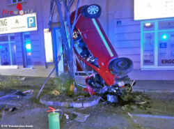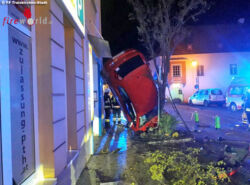 Nö: Pkw steht nach Überschlag senkrecht an Hausfassade