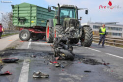 ANSFELDEN (OÖ): Ein Motorrad ist Mittwochnachmittag, 3. April 2019, bei einem Auffahrunfall zwischen zwei Autos, dem Motorrad und einem Traktorgespann in Ansfelden (Bezirk Linz-Land) sofort in Flammen aufgeangen.