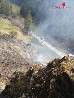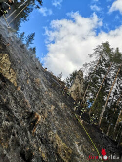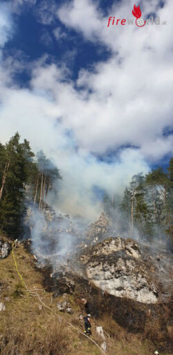 TÜRNITZ (NÖ): Am Samstag, den 6. April 2019, um 14:52 Uhr wurden die drei Feuerwehren der Gemeinde Türnitz zu einem Waldbrand in die Traisenbachrotte alarmiert. Nach einem Abbrand von Holzschnitt fing ein steiler Hang inmitten eines Föhrenwaldes Feuer. Aufgrund des aufkommenden Windes wurde Alarmstufe 3 ausgelöst.