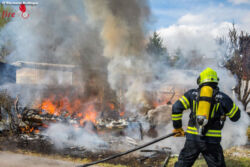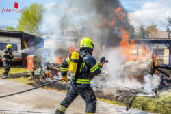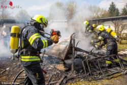 ALKOVEN (OÖ): Nicht einmal eine Stunde nach einem Verkehrsunfall heulten in Alkoven um 14.05 Uhr des 7. April 2019 neuerlich die Sirenen. „Brand eines Wohnwagens, Gstocket, Fkk-Sportliga“ lautete der Einsatzauftrag für die Feuerwehr Alkoven und Polsing.