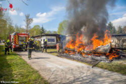 Beim Eintreffen der Feuerwehr vor Ort war ein Wohnwagen bereits weit niedergebrannt. Mit mehreren Feuerlöschern hatte man versucht, die Flammen zu bekämpfen, beschränkte sich in weiterer Folge aber dann mithilfe eines Gartenschhlauchs auf den Schutz der direkt angrenzenden Wohneinheit. Der Wohnwagen selbst war zum Zeitpunkt des Brandausbruchs leer. Ein Atemschutztrupps bekämpfte mittels zweier Hochdruckrohr das inzwischen mehr unter weniger unter Kontrolle befindliche Feuer und löschte es ab.