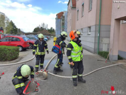Kurze Zeit später traf bereits das erste Tanklöschfahrzeug und die Drehleiter am Einsatzort ein. Aus dem Fenster im 1. Obergeschoss drang bereits Rauch. Die erste Erkundung des Gruppenkommandanten ergab, dass in der Wohnung bereits eine Verrauchung feststellbar war. Daher ordnete er einen Innenangriff mit einem C-Rohr über das Stiegenhaus unter Atemschutz an. Damit das Stiegenhaus als Fluchtweg rauchfrei bleibt kam ein Rauchvorhang zum Einsatz. Dieser mobile Rauchverschluss wird in den Türrahmen der Eingangstüre gespreizt und verhindert damit eine Rauchausbreitung. Schläuche und Atemschutzgeräteträger können aber ungehindert darunter durchkriechen. Zusätzlich wurde eine Druckbelüftung aufgebaut und eine Abluftöffnung im obersten Punkt des Stiegenhauses geschaffen.