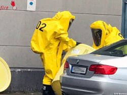 Ordnungsamtsleiterin Jessica Deutsch machte sich vor Ort ein Bild über die Einsatzlage. Die unter Vollschutz eingesetzten Kräfte mussten nach getaner Arbeit vor dem Entkleiden an einem eigens dafür eingerichteten Dekontaminationsplatz gereinigt werden. Zur Absicherung der der Einsatzkräfte waren ein Notarzteinsatzfahrzeug und ein Rettungswagen an der Einsatzstelle.