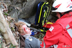 Der Freund der Bikerin verständigte daraufhin die Einsatzkräfte. Dier schwer verletzte Person musste zuerst vom Notarzt und dem Roten Kreuz stabilisiert werden. Nach der Lageerkundung und nach Absprache mit dem Notarzt wurde entschieden die Person mittels Schleifkorbtrage zu retten. Zuerst wurden mehrere Sicherungsseile bzw. ein Geländerseil gespannt um die Rettungskräfte sowie die Patienten zu sichern. Aufgrund der schweren Verletzungen war es nötig die Patientin zu beatmen was während des Tragens eine zusätzliche Herausforderung darstellte. Das teilweise extrem steile Gelände forderte dabei alle beteiligten bis zur Belastungsgrenze.