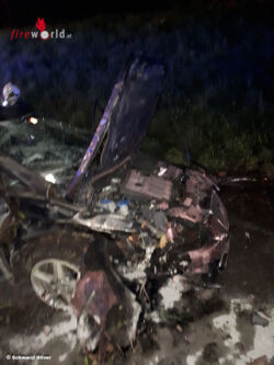 Ein komplett zerstörten Pkw, der sich mehrmals überschlagen hatte, sowie zwei verletzte Fahrzeuginsassen, die von Ersthelfern betreut wurden. Bis zum Eintreffen des mitalarmierten Roten Kreuz übernahmen der Feuerwehrarzt der FF Fresing – Kitzeck sowie Feuerwehrsanitäter die Versorgung der verletzten Personen. Parallel wurde ein zweifacher Brandschutz aufgebaut – der Treibstofftank des Autos war aufgerissen bzw. die Ölwanne defekt. Weiteres musste ein lokale Umleitung eingerichtet werden.