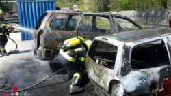Am Einsatzort eingetroffen, fanden die Feuerwehrleute zwei Pkws im Vollbrand vor. Zwei weitere Fahrzeuge waren durch die Nähe zum Brandobjekt stark gefährdet und mussten geschützt werden.