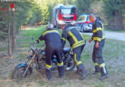 WAIDHOFEN AN DER THAYA (NÖ): Um 08:43 Uhr des 18. April 2019 wurde die Freiwillige Feuerwehr Waidhofen/Thaya zur Bergung eines Motorrades nach einem Verkehrsunfall Nähe Jaudling alarmiert.