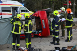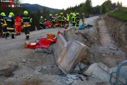 Aus unbekannter Ursache kollidierte ein Richtung Gmunden fahrender Fahrzeuglenker mit einer Beton-Absperrung und kam seitlich am Dach zum Erliegen. Der Lenker wurde dabei in seinem Fahrzeug eingeklemmt. Das Rotes Kreuz, Ortsstelle Scharnstein führte eine Erstversorgung des Verunfallten durch.