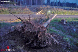 Aufgrund des starken Windes wurde die Fahrzeugbergung unter ständiger Beobachtung der umliegenden Bäume durchgeführt. Der Kleintransporter wurde mit der Seilwinde auf den Wechselladeaufbau-Bergung gezogen und von der Unfallstelle abtransportiert. Zeitgleich wurden die auf die Fahrbahn ragenden Baumteile mit einer Motorkettensäge abgeschnitten und von der Fahrbahn entfernt. Abschließend wurden die ausgeflossenen Betriebsmittel mittels Ölbindemittel von der Fahrbahn entfernt und die Fahrbahn von Fahrzeugteilen gereinigt.