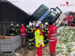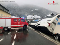 KIRCHBACH (KTN): Am Nachmittag des 28. April 2019 kam ein vollbesetzter Doppeldeckerbus in Reisach (Gde. Kirchbach, Bez. Hermagor) von der Gailtalstraße (B111) ab und kippte gegen einen Stall.