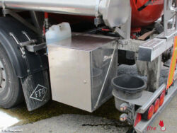 Es handelt sich dabei um ein Abbeizmittel für die Verzinkerei, bestehend aus: Salzsäure, Eisen und Zinn. Durch einen undichten Flantsch sind ca. 300 Liter der Säure in den Oberflächenkanal am Firmenareal geronnen. Durch den Fahrer des Sattelzugs wurde die Vakuumpumpe des Tanks eingeschalten, damit keine Säure mehr entweichen kann.