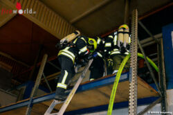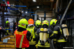 Dort war aus unbekannter Ursache ein Anlagenteil eines Brennofens in Brand geraten. Als der Einsatzleiter Johannes Veroner eintraf waren bereits alle Mitarbeiter aus der Halle in Sicherheit gebracht. Der erste Atemschutztrupp bekämpfte die offenen Flammen, welche bereits bis zur Hallendecke schlugen.