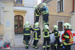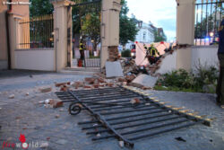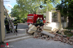 Nach Rücksprache mit der Pfarre wurde entschieden, die einsturzgefährdete Ziegelwand gesichert umzulegen. Dazu wurde mittels Akku-Schere das Torverbindungselement durchtrennt, wodurch die Mauer zu Fall kam. Abschließend wurde der Gehweg umfangreich abgesperrt. Nach über drei Stunden war der Einsatz beendet und die 17 Mitglieder konnten mit ihren vier Fahrzeugen, unter der Einsatzleitung von Kommandant OBI Martin Gall, wieder einrücken um mit den Reinigungsarbeiten zu beginnen.