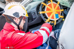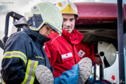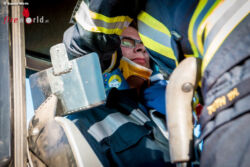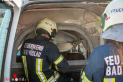 Zeitgleich fand die Rettung der jungen PKW-Lenkerin statt. Mit besonderer Vorsicht wurden das Auto und der tonnenschwere Pflug mittels Pölzholz und einem speziellen Wagenheber gesichert. Erst danach begannen die eigentlichen Rettungsarbeiten. Um dem Notfallsanitäter des Roten Kreuzes einen besseren Zugang zur Patientin zu ermöglichen wurde eine Betreuungsöffnung geschaffen. Derweil begannen die Einsatzkräfte mit der Entladung des voll geräumten Laderaumes. Man entschied sich auch hier für eine achsengerechte und schonende Rettung mit einem Spineboard über den nun freigeräumten Laderaum.