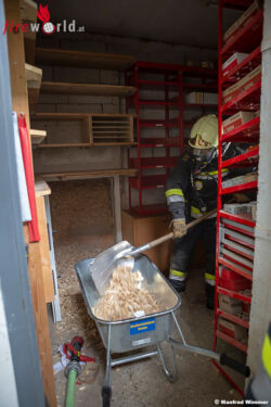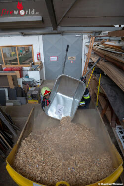 Um den Aufwand möglichst gering zu halten, wurden Container von der Firma Brantner sowie ein Raddumper von der Firma Cramo an die Einsatzstelle beordert. Von der benachbarten Straßenmeisterei wurden Scheibtruhen ausgeliehen. Da sich der Silo inmitten der Tischlerei befindet, galt es das Schüttgut die ersten Meter mit Schaufel und Scheibtruhen zu manipulieren, ehe es maschinell mit dem Raddumper in die Entsorgecontainer gebracht wurde.