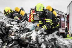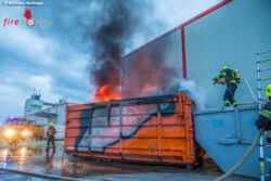Vor Ort stand ein Großcontainer mit gepressten Plastikteilen in Flammen. Dieser war nach oben hin zur Hälfe offen und zur anderen Hälfte geschlossen. Ein Mann reagierte geistesgegenwärtig und versuchte, den Container mit einem Stapler von der direkt angrenzenden Gebäudewand zu schieben. Dies gelang auch zum Teil.