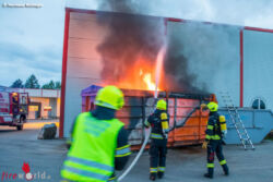 ALKOVEN (OÖ): Um 05.13 Uhr des 15. Mai 2019 wurden die beiden Alkovener Feuerwehren zu einem Containerbrand bei einem Gebäudekomplex zweier Betriebe in Alkoven alarmiert. Schon bei der Anfahrt zum Feuerwehrhaus war von dort eine emporsteigende Rauchsäule zu erkennen.