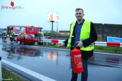 Genau in dem Moment kam ein Feuerwehrmann mit seinem Auto an der Unfallstelle vorbei. Er zögerte nicht, fuhr zur Tankstelle unmittelbar nach der Autobahnabfahrt, wo er sich einen großen Feuerlöscher schnappte und zurück zur Unfallstelle fuhr. Durch die Brandbekämpfung mit dem größeren Löscher konnte ein Vollbrand des Autos erfolgreich verhindert werden. Der Autolenker blieb unverletzt.