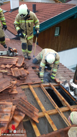 Sofort wurde ein Angriff mittels HD-Rohr durch einen mit schweren Atemschutz ausgerüsteten Trupp gestartet. Parallel wurde das Dach fachmännisch geöffnet um einerseits eine zusätzliche Belüftungsöffnung für den vollkommen verrauchten Dachboden zu schaffen, andererseits die Brandbekämpfung mittels eines zweiten C-Strahlrohres von dieser Stelle aus zu gewährleisten. Die Brandbekämpfung erwies sich als recht schwierig und zeitaufwändig, da auch ein Teil der Außenfassade geöffnet werden musste, um die letzten Glutnester abzulöschen zu können. Nach knapp zwei Stunden erst konnte aufgrund der aufwändigen Arbeiten letztendlich „Brand aus“ gegeben werden.