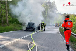 Bis zum Eintreffen der Feuerwehr stand das Fahrzeug bereits in Vollbrand und musste unter Atemschutz abgelöscht werden. Die Besatzung des Rettungswagens untersuchte die Fahrerin, stellte aber keine Notwendigkeit zur weiteren medizinischen Behandlung in einer Klinik fest. Für die Dauer der Löscharbeiten wurde die Bundesstraße komplett gesperrt.