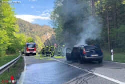 Die 50-jährige Einheimische fuhr mit ihrem Auto auf der B20 von Bad Reichenhall in Richtung Bischofswiesen, als sie zwischen Hallthurm und der derzeitigen Baustelle am Eisenrichter, einen deutlichen Brandgeruch wahrgenommen hatte. Kurz darauf zog dichter Rauch aus der Motorhaube, worauf die Frau sofort anhielt und das Fahrzeug unverletzt verlassen konnte. Weitere Verkehrsteilnehmer setzen umgehend einen Notruf ab, worauf die Leitstelle Traunstein sofort die Feuerwehr Bischofswiesen und das Berchtesgadener Rote Kreuz mit einem Rettungswagen los schickte.