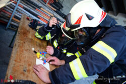 Im Anschluss an die körperliche Belastung wurde das Gehirn mit räumlichen Vorstellungsvermögen auf die Probe gestellt. Beim Lego für Atemschutzträger galt es die Anweisungen des Truppführers möglichst gut zu verstehen und diese umzusetzen. Der Truppführer hatte die Struktur einer aus Legosteinen aufgebauten Figur per Funk an die Truppmänner weiterzugeben. Diese hatten zu Beginn der Aufgabe eine leere Platte vor sich und mussten den Erklärungen des Truppführers für den Aufbau folgen.