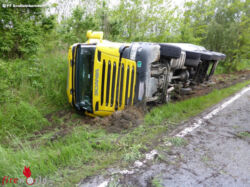 Die Einsatzstelle wurde diese abgesichert und nach der Lageerkundung ein Austreten von Betriebsflüssigkeiten ins Erdreich verhindert. Die Lenkerin wurde vorsorglich vom Roten Kreuz in ein Krankenhaus abtransportiert. Da der Lkw seitlich im Graben lag, musste für die Bergung die FF Hollabrunn mit dem Kranfahrzeug nachalarmiert werden. Durch ein Transportunternehmen wurde das geladene Erdreich umgeladen. Im Anschluss konnte der Laster durch den Einsatz mehrerer Seilwinden wieder aufgerichtet und zurück auf die Straße gezogen werden. Nachdem ein beschädigter Reifen des Fahrzeuges durch einen Ersatzreifen getauscht worden war, konnte der Lkw von der Einsatzstelle entfernt und gesichert abgestellt werden. Nach der Reinigung der Fahrbahn konnte die Sperre der Bundesstraße aufgehoben und ins Feuerwehrhaus eingerückt werden.