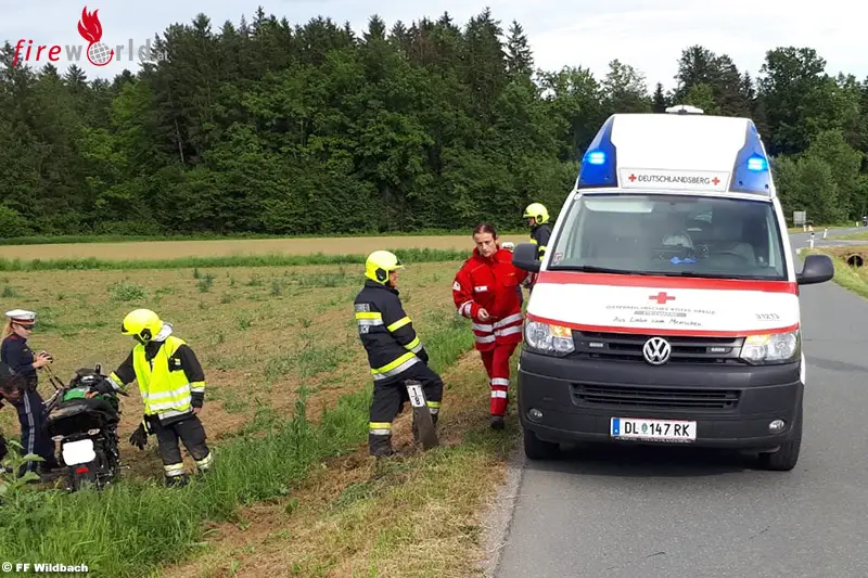 Am Einsatzort angekommen stellte sich heraus, dass es sich um einen um einen Verkehrsunfall mit einem Motorrad im Bereich Kreuzung L647 Wildbacherstraße handelte. Beim Eintreffen der Feuerwehr wurde der Lenker bereits durch einen Mitarbeiter des Grünen Kreuzes versorgt, welcher zufällig an der Unfallstelle vorbeikam. Ebenfalls vor Ort war das Rote Kreuz mit einem RTW und 2 Mann.