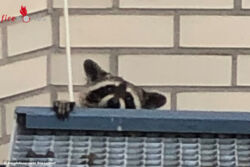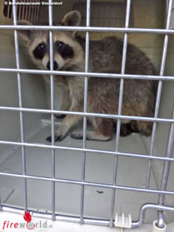 Gegen 19 Uhr am frühen Abend meldete der Sicherheitsdienst der ehemaligen Fachhochschule auf der Georg-Glock der Feuerwehrleitstelle Düsseldorf einen verirrten Waschbären. Zufällig hatten Teilnehmer eines Seminares in einer Raucherpause das Tier entdeckt und den Sicherheitsdienst verständigt. Zwei Kollegen der Feuerwache Münsterstraße rückten mit entsprechendem Tierfanggerät aus zur Rettung! Davon war der Waschbär allerdings wenig begeistert und kletterte erst mal auf einer Außenfluchttreppe bis in die 3.Etage! Dort war er jedoch gefangen, weil es nicht mehr weiter ging!