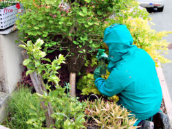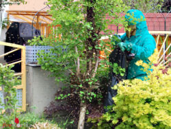 Danach wurde versucht, die Bienen in einen Sack zu wischen. Aufgrund der dichten Verzweigung des Baumes gelang das allerdings nur teilweise. Es wurde beschlossen, die gesamten Äste des Baumes abzuschneiden, sodass nur noch der Stamm auf dem das Bienenvolk war sehen blieb. Dann wurde abgewartet, bis sich das Volk wieder komplett darauf gesammelt hat. Als es soweit war, wurde über den gesamten Stamm samt Bienenvolk ein Müllsack gestülpt und dieser mit einem Kabelbinder um den Stamm geschlossen.