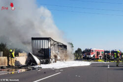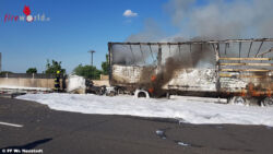 Nö: Lenker bei Unfall aus Fahrerkabine geschleudert, Auflieger mit Haushalts-Chemikalien brennt