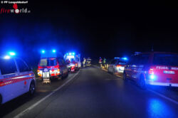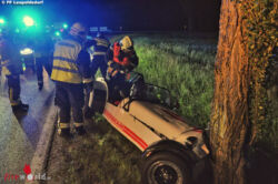 Ein Fahrzeug kam von der Straße ab und kollidierte mit einem Baum. Bei dem Unfall erlitten zwei Personen Verletzungen unbestimmten Grades. Die Alarmierung der Feuerwehr erfolgte um 01:05 Uhr. Die Einsatzkräfte der Freiwilligen Feuerwehr Leopoldsforf unterstützten die Rettungskräfte bei der Personenrettung und bargen im Anschluss das schwer beschädigte Fahrzeug.