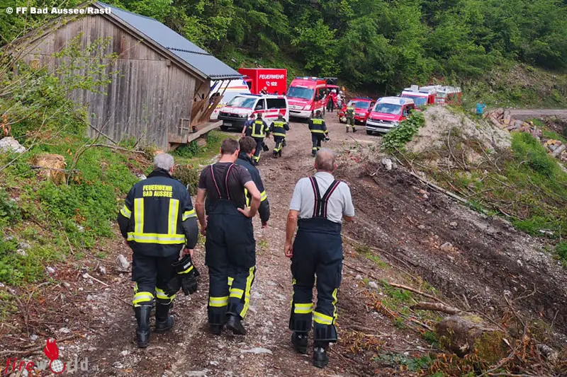 An die 55 Einsatzkräfte mit 13 Fahrzeugen und einem Hubschrauber rückten nach der Meldung „Regungslose Person am Traunufer Nähe Jausenstation“ aus. Nach der Unfallortsuche in unwegsamen Gelände wurde die Person am rechtsseitigen Ufer gesichtet, hier war ein Herankommen nur über den Forstweg Sarstein möglich, sodass alle Einsatzkräfte umdisponiert werden mussten. Mittlerweile wurde die Person vom C14 gesichtet und von hier aus die Bergung eingeleitet, der zweite Kanufahrer befand sich am linken Ufer, war unverletzt und wurde von der Feuerwehr gerettet. Die gesuchte Person konnte zu Fuß zum Forstweg geführt werden und wurde vorsorglich in das LKH Bad Aussee eingeliefert.