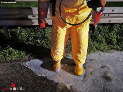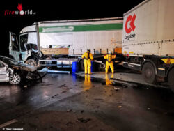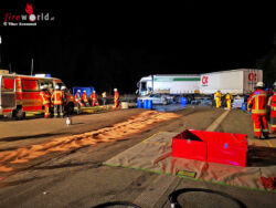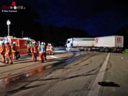 Um 21.56 Uhr die Feuerwehr Bruchsal mit den Abteilungen Bruchsal und Untergrombach zu einem LKW Verkehrsunfall mit eingeklemmter Person auf die BAB 5 in Fahrtrichtung Karlsruhe gerufen. Zwischen der Anschlussstelle Bruchsal und der Noteinfahrt Untergrombach kam es auf Höhe des Parkplatzes zu einem Unfall, bei dem ein Lkw über alle Fahrbahnen liegenblieb und flüssige Ladung auslief. Eine nachfolgende PKW Lenkerin kollidierte mit dem querstehenden LKW. Entgegen der ersten Meldung war der LKW-Fahrer nicht eingeklemmt. Er konnte sich selbstständig mit schweren Verletzungen aus seinem Führerhaus befreien. Die Pkw-Lenkerin verletzte sich leicht. Aus dem verunfallten LKW lief eine unbekannte Flüssigkeit von der Ladefläche auf die Fahrbahn. Mit Schutzanzügen und unter Atemschutz wurde von der Feuerwehr die Plane des LKW geöffnet. Durch den Unfall waren Teile der Ladung beschädigt und aus einem IBC Container lief die unbekannte Flüssigkeit aus.