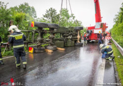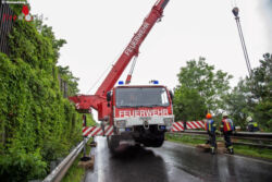 Dafür wurde der gepanzerte Lkw mittels der Seilwinde vom RLF Gießhübl gegen weiteres Umstürzen gesichert. Anschließend wurde am Containeraufbau angeschlagen und dieser vom Lkw getrennt. Der Container wurde dann auf die Fahrbahn der Auffahrt gehoben und dort gesichert abgestellt. Im zweiten Hubvorgang wurde mittels Kettengehänge am Zugfahrzeug angeschlagen und dieses ebenfalls in den Bereich der Ausfahrt gehoben.