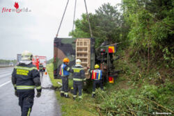 Nach Aufbau eines Brandschutzes und Auffangen bzw. Binden von ausgelaufenen Betriebsmitteln konnte mit den Vorbereitungen der Bergung begonnen werden. Dafür mussten mittels Motorkettensäge Bäume und Sträucher durch die Einsatzkräfte entfernt werden. Nach Rücksprache mit dem anwesenden Autobahnmeister wurde entschieden, die Bergung über die Auffahrt Gießhübl durchzuführen. Diese wurde dafür vollständig für den Verkehr gesperrt. Nach Aufstellen des Sonderfahrzeuges Kran im Bereich der Auffahrt konnte die Bergung beginnen.