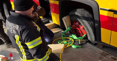 Dafür wurde der gepanzerte Lkw mittels der Seilwinde vom RLF Gießhübl gegen weiteres Umstürzen gesichert. Anschließend wurde am Containeraufbau angeschlagen und dieser vom Lkw getrennt. Der Container wurde dann auf die Fahrbahn der Auffahrt gehoben und dort gesichert abgestellt. Im zweiten Hubvorgang wurde mittels Kettengehänge am Zugfahrzeug angeschlagen und dieses ebenfalls in den Bereich der Ausfahrt gehoben.