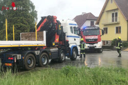 Ein 4-achsiger Lkw samt Anhänger musste seine Ladung bei einem im Bau befindlichen Objekt abladen bzw. die Zimmermannsarbeiten unterstützen. In den Morgenstunden war der nicht befestigte Weg noch trocken und der Lkw-Fahrer konnte sein Gefährt rückwärts zur Baustelle lenken. Am Nachmittag setzte aber starker Regen ein und weichte den Untergrund auf. Nach der Beendigung der Arbeiten wollte er Lkw-Fahrer sein Schwerfahrzeug über den unbefestigten Weg wieder verlassen. Doch trotz zweier angetriebener Achsen blieb der Lkw stecken.