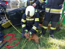Nach Rettung der verletzten Insassen stellten die Einsatzkräfte fest, dass sich beifahrerseitig noch einer der beiden mitgeführten Hunde im Fahrzeug befand. Auch hier war der Einsatz eines hydraulischen Rettungsgerätes notwendig, um das leicht verletzte Tier zu befreien. Inzwischen war auch der Notarzthubschrauber eingetroffen, der den schwer verletzten Fahrer des Unfallfahrzeuges aufnahm. Die beiden Feuerwehren sicherten noch gemeinsam mit den Kräften der ASFINAG die Unfallstelle ab und stellten den Brandschutz sicher.