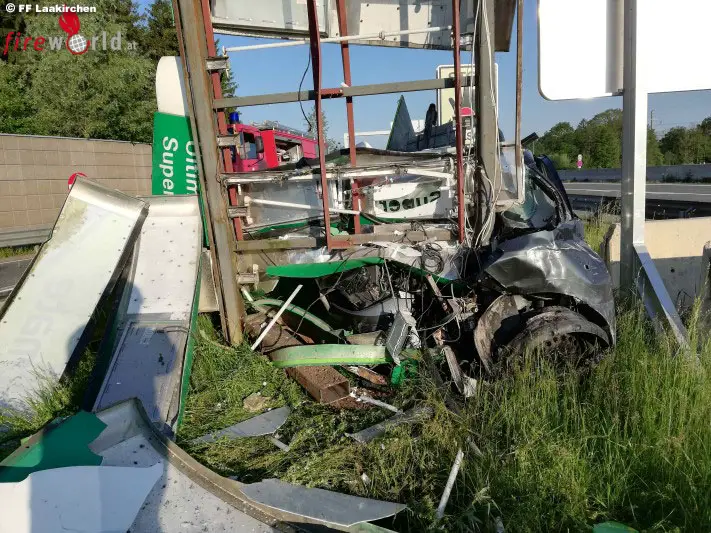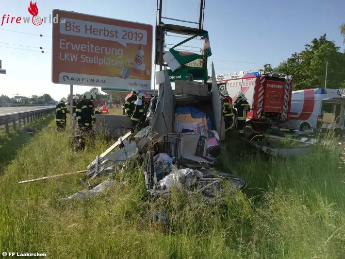 LAAKIRCHEN (OÖ): Erneut kam es in den Morgenstunden des 2. Juni 2019 zu einem schweren Verkehrsunfall auf der Autobahn A1 im Bereich der Raststätte Lindach (Stadt Laakirchen). Ein Pkw mit Anhänger war im Bereich der Abfahrt gegen eine große Hinweistafel geprallt – der Anhänger schob sich mit voller Wucht in das Heck des Fahrzeuges.
