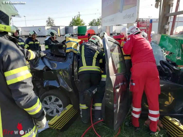 Eine Person am Rücksitz konnte schwer verletzt relativ leicht befreit werden. Der Fahrer war jedoch schwerst eingeklemmt und musste mit zwei Bergescheren der Feuerwehren Laakirchen und Steyrermühl in Zusammenarbeit mit dem Notarztteam des Roten Kreuzes befreit werden.