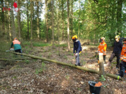 Am Samstag, 1. Juni 2019, absolvierten vier Jungen und ein Mädchen der Schülerfeuerwehr, die das erforderliche Mindestalter erreicht hatten, in einem Waldstück des Hibbens-Hofes der Familie Hoops in Ebbingen den Grundlehrgang für die Arbeit mit Motorsägen. Dieses niedersachsenweit einmalige Projekt wurde anhand der strengen Vorgaben des Gesamtverbands Deutsche Gesetzliche Unfallversicherung (DGUV) von den beiden Oberschullehrern Hans-Jörg Schmidt und Ingo Harmrolfs erarbeitet und umgesetzt. Schmidt, der zugleich Forstwirtschaftsmeister und langjähriger Sägenausbilder ist, übernahm die Lehrgangsleitung sowie die theoretische und praktische Ausbildung. Harmrolfs, zugleich Leiter der Schülerfeuerwehr, stellte gemeinsam mit den Eltern die erforderliche persönliche und fachliche Eignung der Teilnehmer fest und erstellte das Ausbildungskonzept gemäß Jugendschutzgesetz und DGUV-Vorschrift 214-059. Hiernach ist das nun durchgeführte Ausbildungsmodul A „Grundlagen der Motorsägenarbeit" der Basislehrgang für das Bearbeiten von liegendem Holz im Rahmen der Gefahrenabwehr.