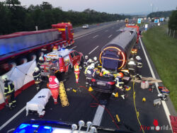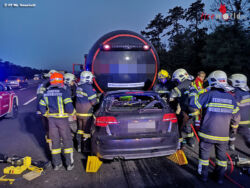 Aus bislang unbekannter Ursache fuhr der Audi auf den Sattelauflieger auf der A2 Fahrtrichtung Graz bei km 50 auf. Der Lenker des Sattelzuges, welcher 40 Tonnen heißen Bitumen geladen hatte, bemerkte dies und konnte kurz vor dem Rastplatz Steinfeld anhalten. Da der Lenker des Pkw im Fahrzeug eingeklemmt war und der Pkw etwa 1,8 Meter unter den Auflieger verkeilt war, setzte der Sattelzuglenker die Rettungskette sofort in Gange.