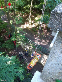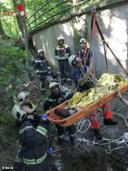 WIEN: Ein Mann war in der Nähe der Kohlenbrennerbrücke bei der Höhenstraße Dienstagvormittag, 4. Juni 2019, in einem Graben gestürzt und hat sich dabei schwer verletzt. Die alarmierten Kräfte der Berufsfeuerwehr Wien übernahmen die Erstversorgung des Mannes und brachten ihn mit einer Rettungswanne entlang des Bachbetts zur Kohlenbrennerbrücke. Dort wurde er mit einem Flaschenzug und einer Drehleiter auf Straßenniveau gehoben und zur weiteren notfallmedizinischen Versorgung an die Berufsrettung Wien übergeben. Die Höhenstraße war während des Einsatzes gesperrt.