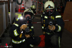 Um den Verletzten zu retten, wurde zunächst das Hubrettungsfahrzeug in Stellung gebracht und ein weiterer Atemschutztrupp begab sich über eine Steckleiter auf das Dach, um die Person anschließend über die Rettungsplattform des Steig zu Boden befördern zu können. Nachdem die Meldung "Brand aus" erfolgte begannen die umfangreichen Aufräumarbeiten, noch am Übungsort fand eine ausführliche Nachbesprechung statt.